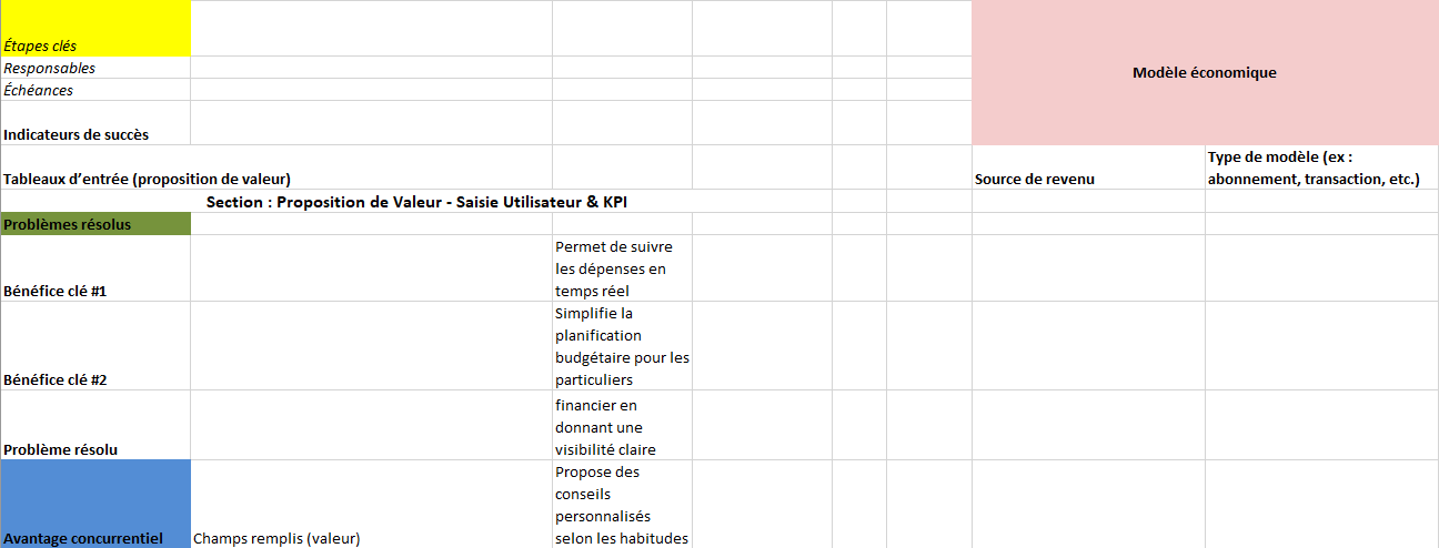 Vous pouvez utiliser un outil comme le Business Model Canvas, ou simplement un tableau Excel structuré en zones : bénéfices, problèmes, caractéristiques clés, avantage concurrentiel.