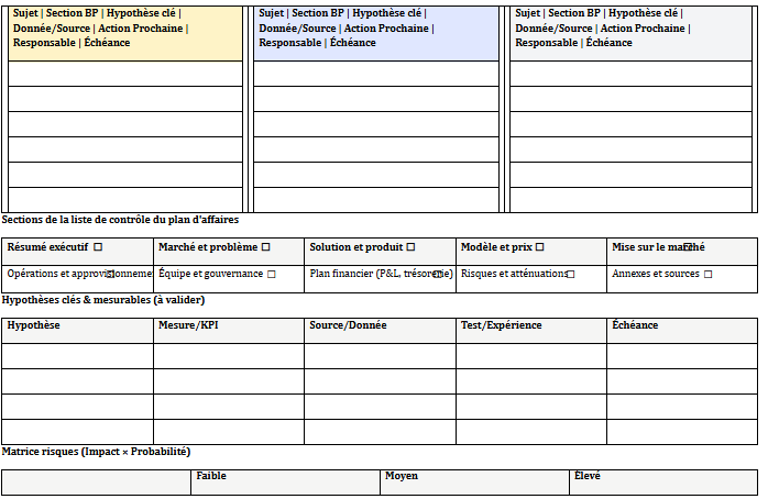 Un business plan est une machine à décider. Misez sur l’idée forte, reliez-la aux unités économiques, cadrez deux canaux GTM maximum, écrivez des hypothèses traçables et montrez la sensibilité. Avec ces techniques, vous obtenez un document qui convainc et, surtout, qui sert au quotidien.