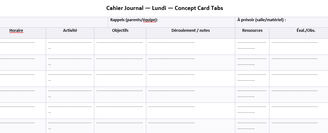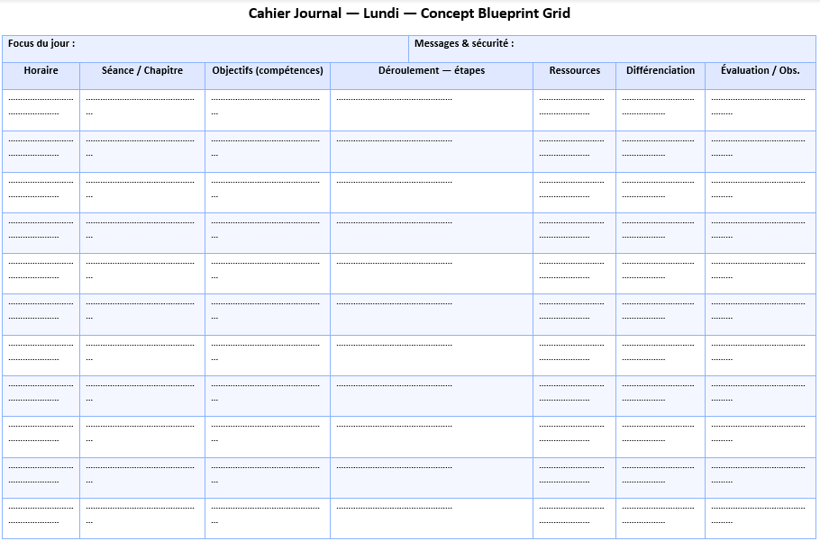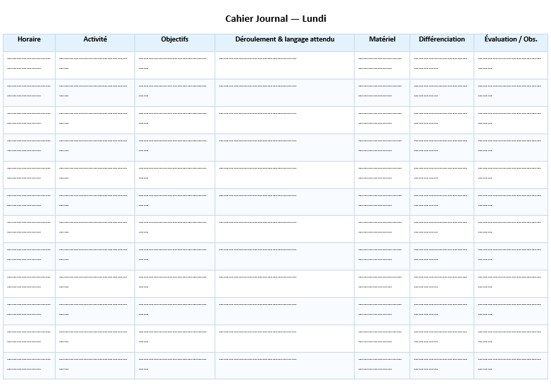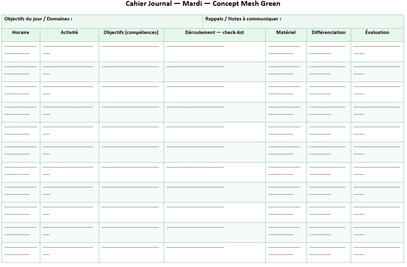 Le métier s’est densifié : pluralité des profils, besoins spécifiques, co-interventions, continuité école-famille. Le cahier journal est devenu un hub d’intentions et de preuves. Il cadre la journée, explicite le langage attendu, fixe des indicateurs observables. Il ne remplace pas les progressions ou les programmations ; il les met en scène à l’échelle du jour ou de la semaine et donne au terrain un cap concret.