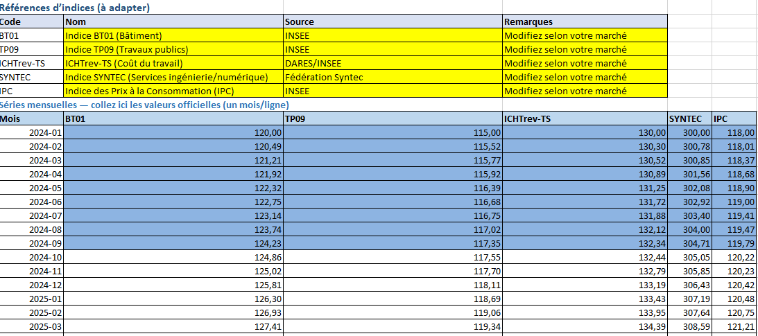 yyyy-mm, 1er du mois) - Col. B → F : valeurs des indices (ex. BT01, TP09, ICHTrev-TS, SYNTEC, IPC — vous pouvez adapter les en-têtes).