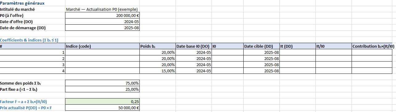 Actualiser le prix initial P0 de votre marché entre DO et DD à partir d’un ou plusieurs indices (jusqu’à 4) selon la formule usuelle :