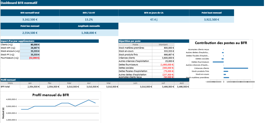 Le BFR normatif, quant à lui, apporte une dimension supplémentaire. Il ne se contente pas d’observer une situation passée. Il permet d’anticiper, de modéliser et de simuler les besoins futurs en fonction de paramètres précis. Lorsqu’il est intégré dans un modèle Excel automatisé, il devient un véritable outil d’aide à la décision.