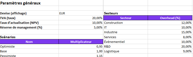 • Paramètres : devise (€), TVA, taux d’actualisation, scénarios (Optimiste/Base/Pessimiste), liste des secteurs, overhead par secteur, réserve de management.