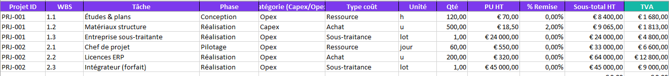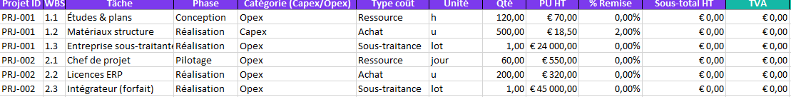 • WBS_Projet : là où vous chiffrez finement (catégorie Capex/Opex, type de coût Ressource/Achat/Sous-traitance/Dépense, unité, quantité, PU, remises).