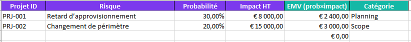 • Risques : registre des risques (probabilité × impact = EMV) par projet.
