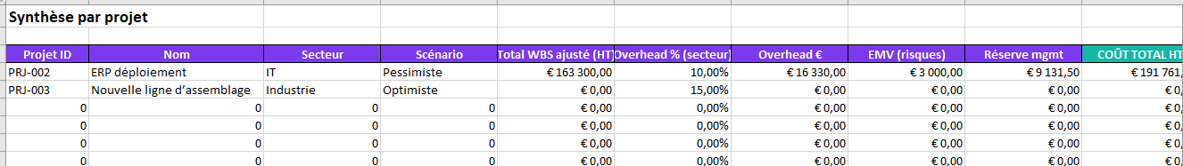 • Synthèse : totaux par projet (HT), overhead, EMV, réserve, TVA, coûts TTC, coût moyen par mois.