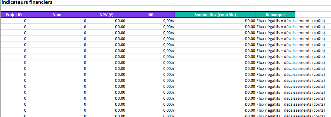 • Financier : NPV/IRR des projets (dépenses = flux négatifs), basé sur la ligne Cashflow et le taux d’actualisation.