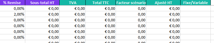 • Quantité × Prix unitaire × (1 – remise) = Sous-total HT par ligne.