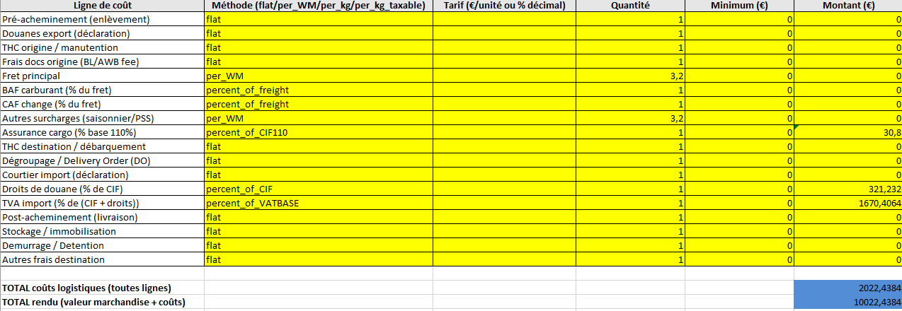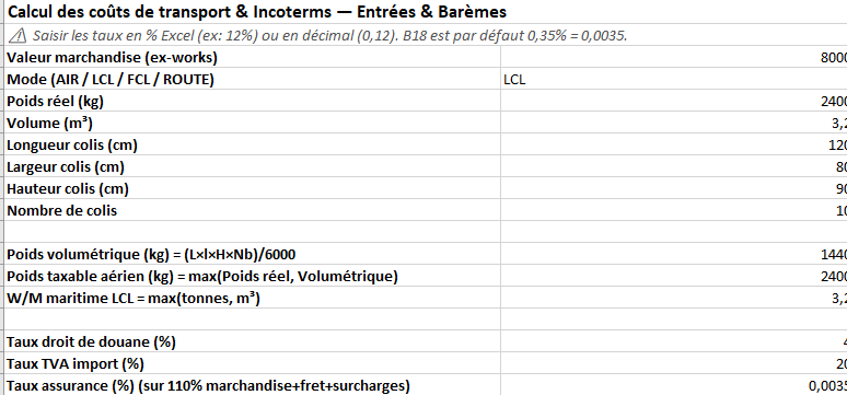 12%ou0,12(les deux marchent). - Le coût rendu total reste identique d’un Incoterm à l’autre ; seule la répartition change.