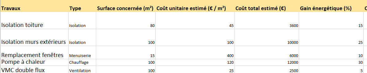 | Isolation toiture | 80 m² | 45 €/m² | 3 600 € | 15 % |