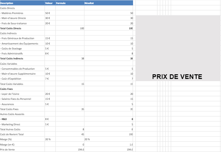 Le coût de revient total est calculé en additionnant tous ces éléments. Voici la formule générale :