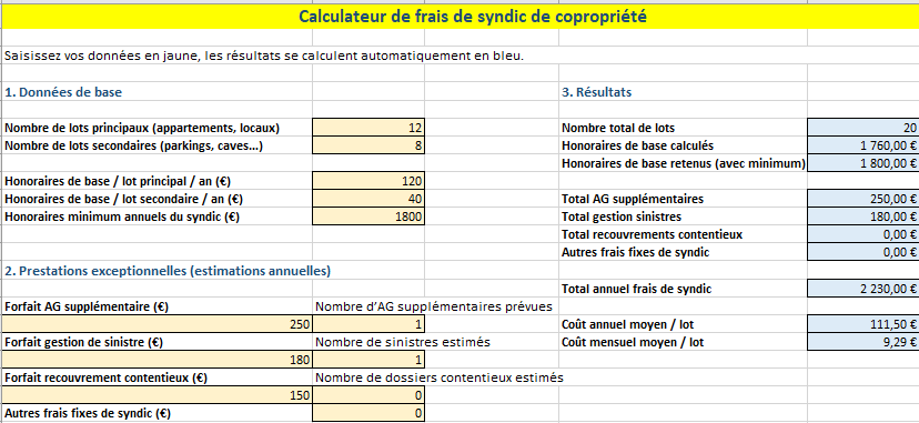 Le calculateur de frais de syndic est un tableau Excel prêt à l’emploi qui permet d’estimer rapidement le coût réel d’un syndic de copropriété.