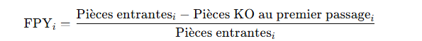 - le FPY (First Pass Yield) de chaque étape = % de pièces bonnes du premier coup ;