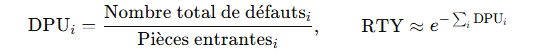 - le RTY (Rolled Throughput Yield) = rendement cumulé de bout en bout (probabilité qu’une pièce traverse toutes les étapes sans retouche).