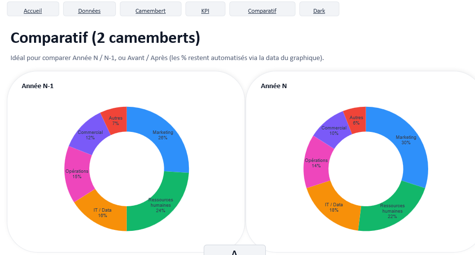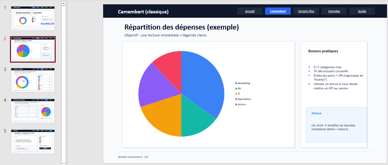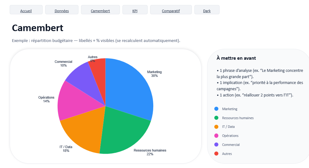 C’est là qu’un modèle enrichi (cartes KPI, mini-table, focus sur la part principale) devient très puissant : il transforme une répartition en message.