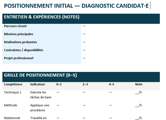 Deuxième temps, le diagnostic de positionnement. Ici, pas de « ressenti » : une grille 0–5 par compétence avec indicateurs observables (« applique une procédure », « interprète un jeu de données simple »), un court entretien (parcours, réalisations, contraintes), et une recommandation claire : admis, liste d’attente, prérequis à renforcer, orientation alternative.
