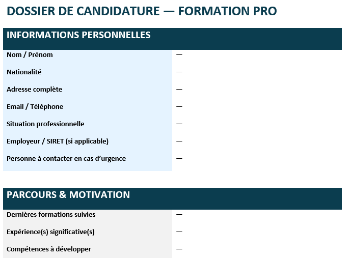 Vos données sont traitées pour l’étude de votre candidature et l’organisation de la formation. Vous pouvez exercer vos droits d’accès, de rectification et de suppression via [contact]. Données conservées [durée], puis purgées.
