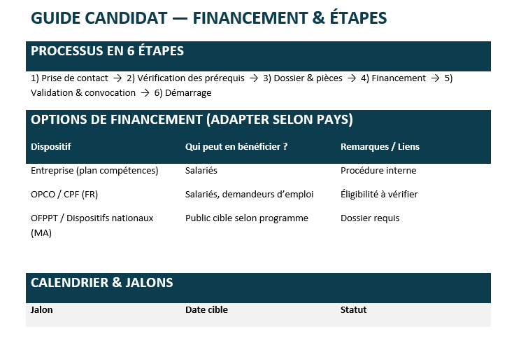 Dernier maillon, le guide candidat — financement & étapes. Il déroule le parcours en jalons (prise de contact, auto-évaluation, positionnement, dossier, financement, convocation) et fournit check-lists et dates cibles.