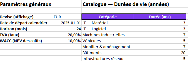 - Paramètres & catalogue : taux de TVA, WACC, durées de vie standard.