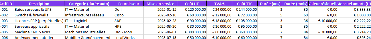 - Durée de vie incohérente : figez un catalogue (IT 3 ans, véhicules 5, machines 7, bâtiments 20…).