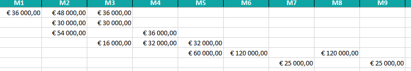 - M2 ~ 158,4 k€, M6 ~ 144 k€, M8 ~ 144 k€, M5 ~ 110,4 k€.