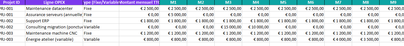 | PRJ-001 Datacenter | 180 000 € | 216 000 € | 65 000 € | CAPEX en M1–M3 (fort pic M2) ; OPEX récurrents (maintenance) + assurance annuelle M1 |