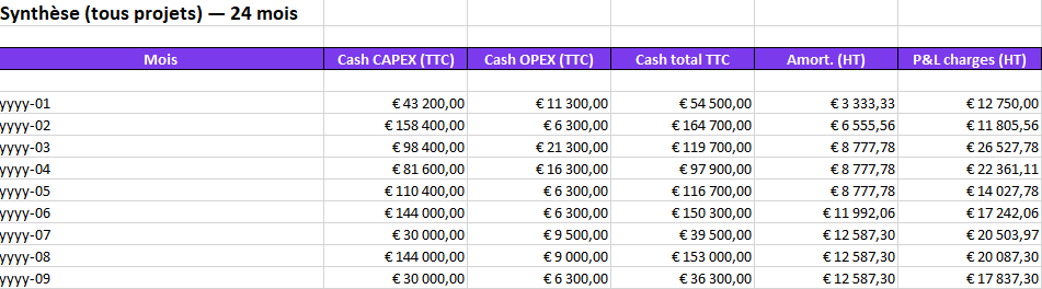 Astuce : encodez les paiements CAPEX en HT par mois (M1..M24), calculez TTC via
