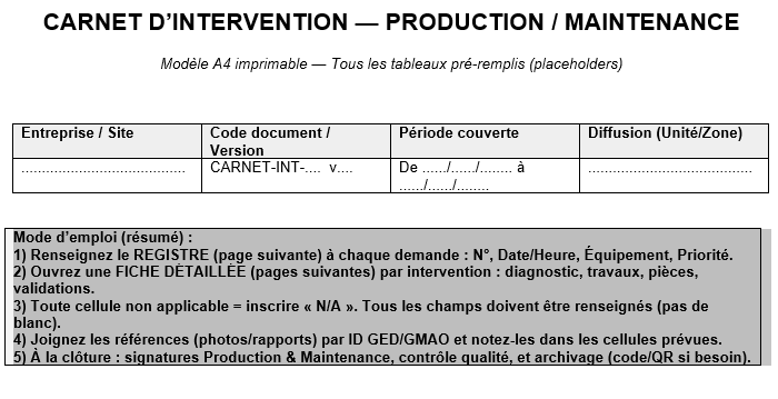 - Titre “Carnet d’intervention — Production / Maintenance”.