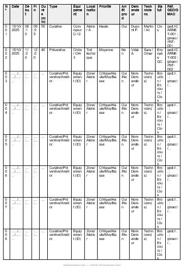 - Colonnes utiles et concises : N° intervention, date, début/fin, durée, type (curative/préventive/amélioration), équipement/ID, localisation, priorité, arrêt prod (oui/non), demandeur, techniciens, statut (brouillon/en cours/clos), références GED/GMAO.