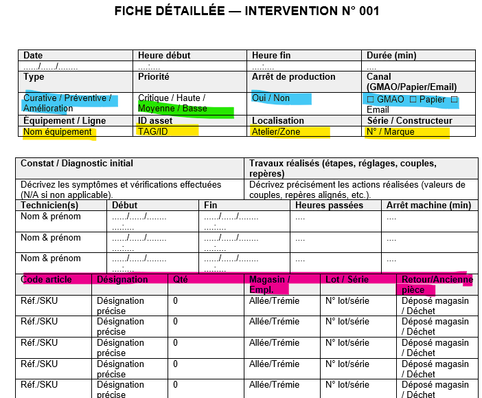 - Bloc Pièces & consommables : code article, désignation, quantité, magasin/empl., lot/série, retour ou mise au rebut.