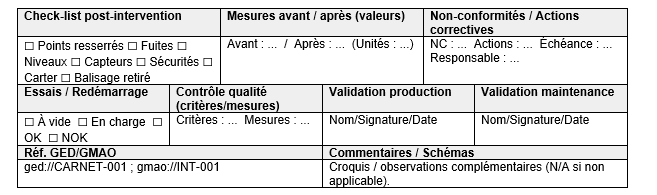 - Bloc Validations : essais (à vide / en charge), critères qualité, signatures Production et Maintenance, date.