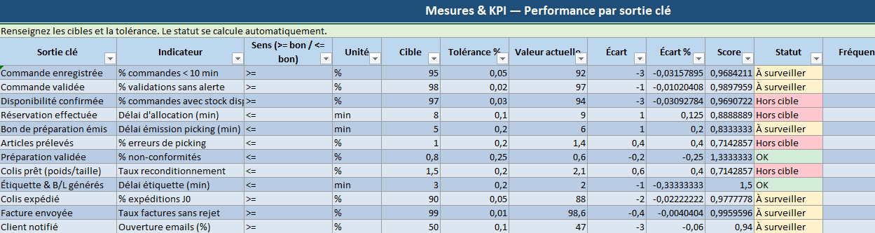 • Créer 1 KPI principal par sortie (cible + tolérance + sens).