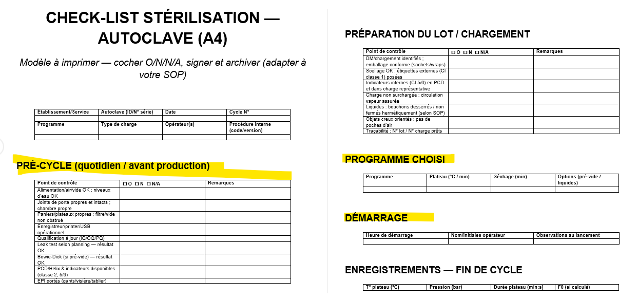 - Signatures : opérateur, responsable stérilisation, qualité/pharmacien.