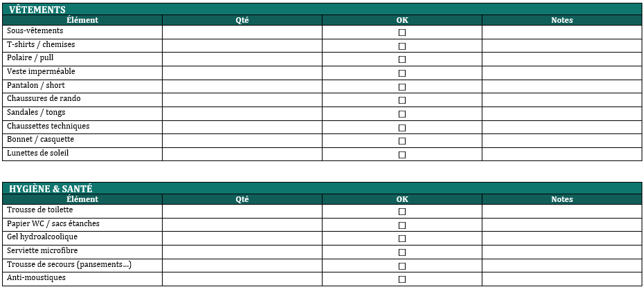 - d’une série de tableaux thématiques avec quatre colonnes : Élément, Qté, OK (case à cocher) et Notes (remarques, variantes, emplacement dans le véhicule).
