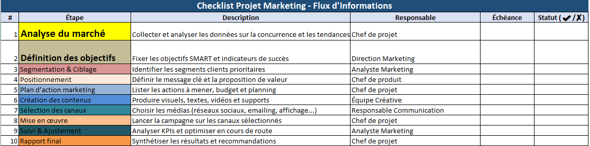 Cette checklist vise à structurer toutes les étapes d’un projet marketing, de l’analyse initiale à la présentation des résultats.