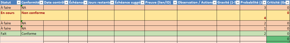 - Section → Sous-processus (listes dépendantes), Point de contrôle, Critères, Fréquence, Priorité (Haute/Moyenne/Basse), Responsable, Statut (À faire / En cours / Fait / NA), Conformité (Conforme/Non conforme/NA), Dates (contrôle/échéance/clôture), Preuve/Observations, Gravité, Probabilité, Criticité, On-time (OTD).