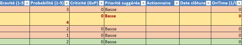 =IF(AND(Q>0,R>0), Q*R, 0) // Criticité = Gravité × Probabilité