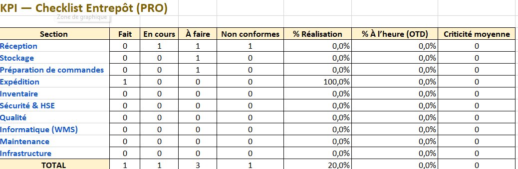 Télécharger un modèle Excel de Checklist de gestion d’entrepôt, Tableau de Bord — Gestion d’Entrepôt KPI’s ⬇️
