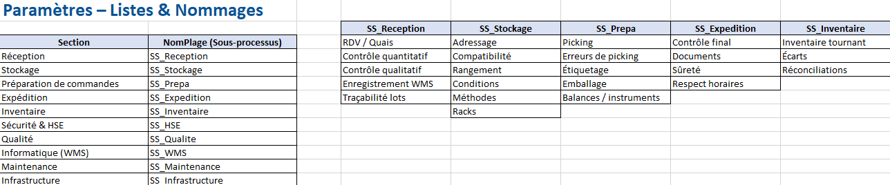 - Définissez vos Sections et leurs Sous-processus (plages nommées), vos Responsables, vos listes de Fréquences/Priorités/Statuts/Conformités.