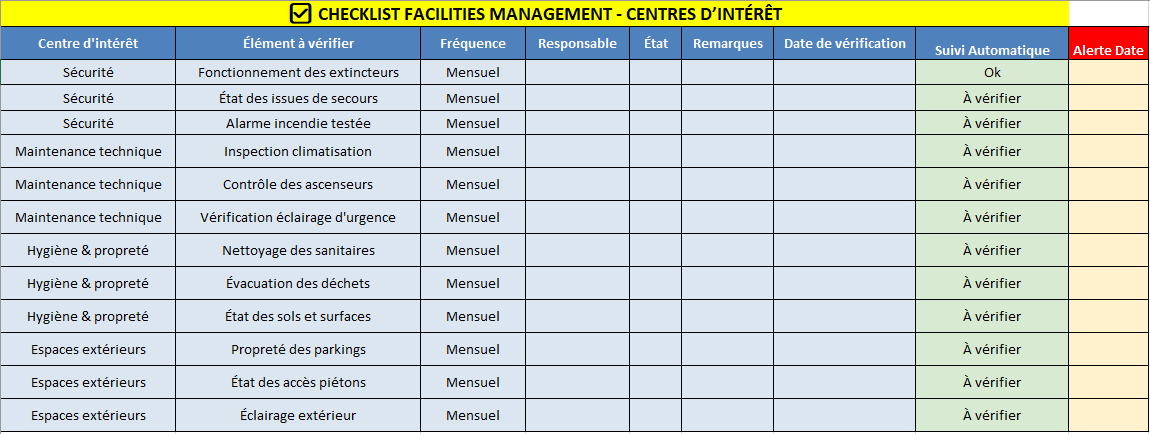 - Chaque élément à vérifier est détaillé (ex. : état des extincteurs, inspection des ascenseurs).