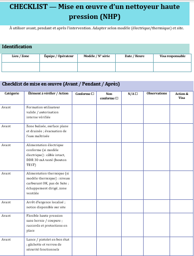 Checklist — Mise en œuvre d’un nettoyeur haute pression (NHP)