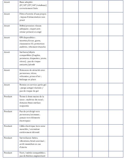 - Inspection visuelle hebdo des tuyaux HP/pistolet/manomètre.