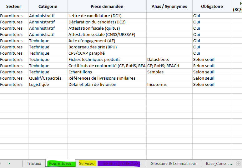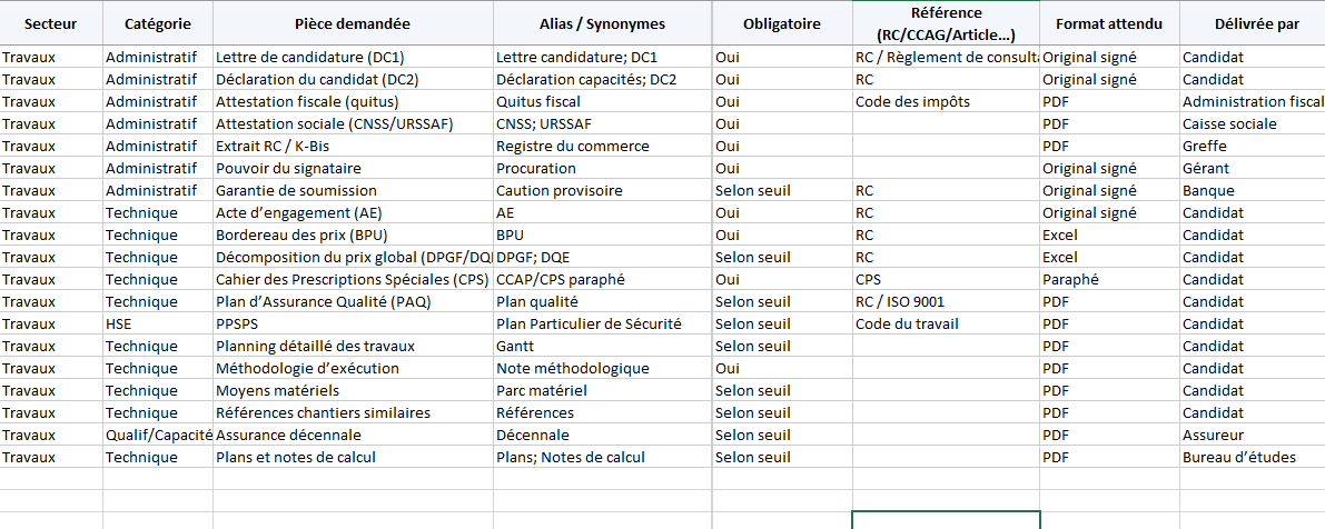 Chaque ligne = une pièce attendue, avec colonnes Catégorie (Administratif/Technique/Financier/HSE/Capacités), Obligatoire (Oui/Non/ Selon seuil), Format attendu (Original signé, PDF, Excel, etc.), Délivrée par, Validité, Responsable, Date d’envoi, Statut (À faire / En cours / OK / N/A), Lien/chemin, Observations. - Glossaire & Lemmatiseur : dictionnaire des alias → lemma (ex. DC1, Lettre de candidature →