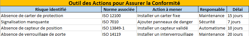 | Absence de carter de protection | ISO 12100 | Installer un carter fixe | Maintenance | 15 jours |