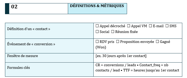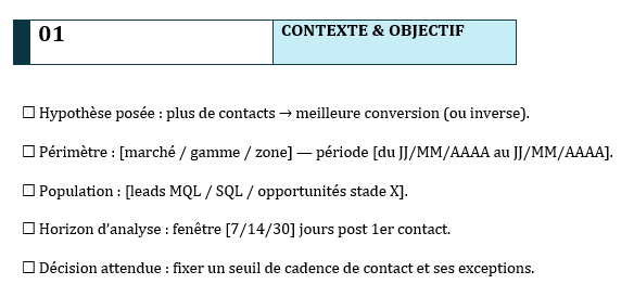 - Champs : hypothèse (“+ de contacts → + de conversion ?”), périmètre (marché/zone), population (MQL/SQL), fenêtre (7/14/30 j), décision attendue.