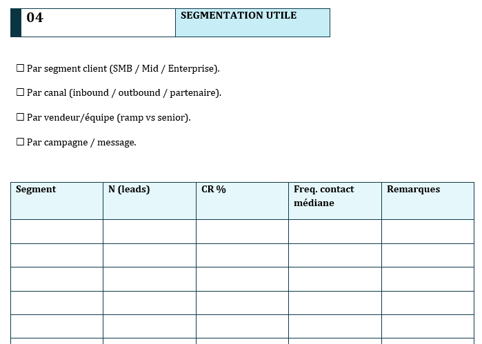 - Tableau “Segment • N (leads) • CR % • Fréquence médiane • Remarques”.