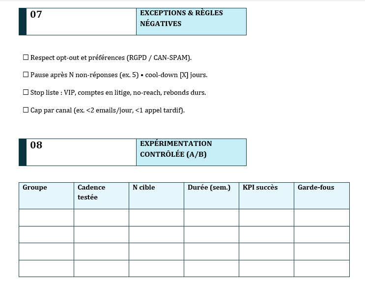 - Expérimentation (A/B) — tableau “Groupe • Cadence testée • N cible • Durée • KPI • Garde-fous”.