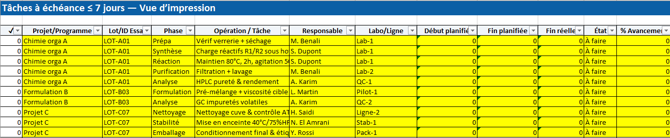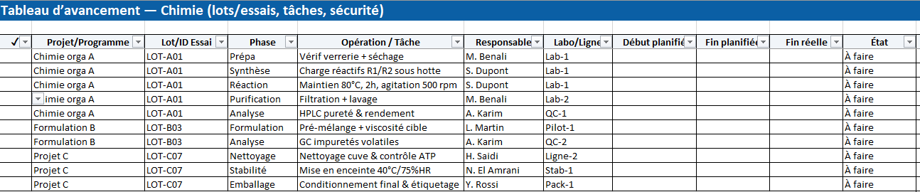 - Qui / Quoi / Où : Projet, Lot/ID Essai, Phase (Prépa, Synthèse, Réaction…), Tâche, Responsable, Labo/Ligne.