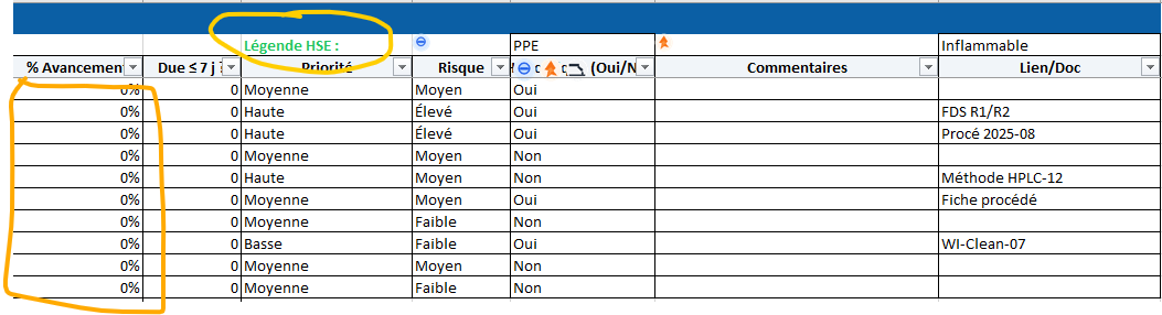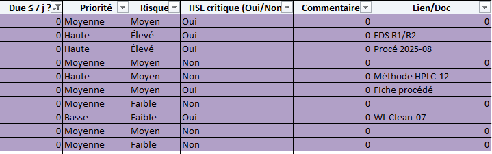- Risques & HSE : Priorité, Niveau de risque, HSE critique (Oui/Non), Commentaires, Lien/Doc (FDS, méthode analytique…).
