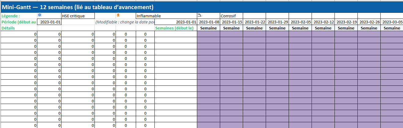 Tableau d’avancement — Chimie, le mini-Gantt 12 semaines et les pictos HSE – Modèle Excel